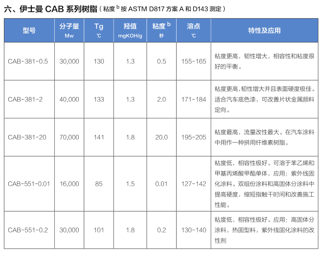 我公司代理的CAB樹(shù)脂有:醋酸丁酸纖維素CAB-381-0.5、醋酸丁酸維素CAB-381-2、醋酸丁酸纖維素CAB-381-20、醋酸丁酸纖維素CAB-551-0.2、醋酸丁酸纖維素CAB-381-0.01