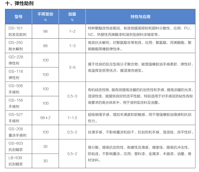 手感劑GS527,手感劑GS506:能有效提高涂膜的抗劃傷性和手感,提高涂膜的光澤,混溶性佳,能提供良好的流平性能,特別適用于對手感及防粘性有較高要求的高光體系中。